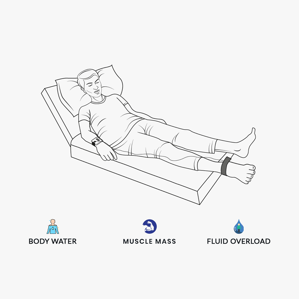 ‘The measurement of body hydration using the inbioZ device is valuable for estimating total body water (TBW) and volume overload, as well as determining body fat percentage and muscle mass. The InBioZ wrist wearable clinical device, along with a leg band and a connector wire, is specifically designed to assist patients with End Stage Renal Disease (ESRD) undergoing hemodialysis (HD). The device provides an accurate and easy estimation of body fluid content, which can greatly aid clinical decision-making.